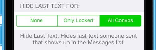 Ensuite, une option vous permet de choisir pour quel type de conversation le tweak doit cacher le dernier message qui s’affiche dans la liste des conversations. Vous avez le choix entre aucune, uniquement celle qui sont verrouillées ou toutes.