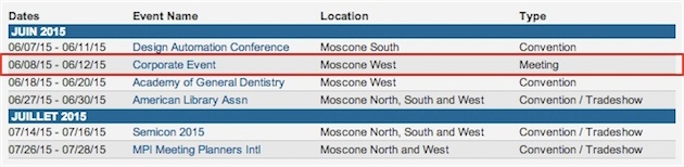 En effet, pour les dates du 8 au 12 juin 2015, le Moscone Center de San Fansico affiche une réservation sans nom spécifique, avec uniquement la mention « Corporate event« .