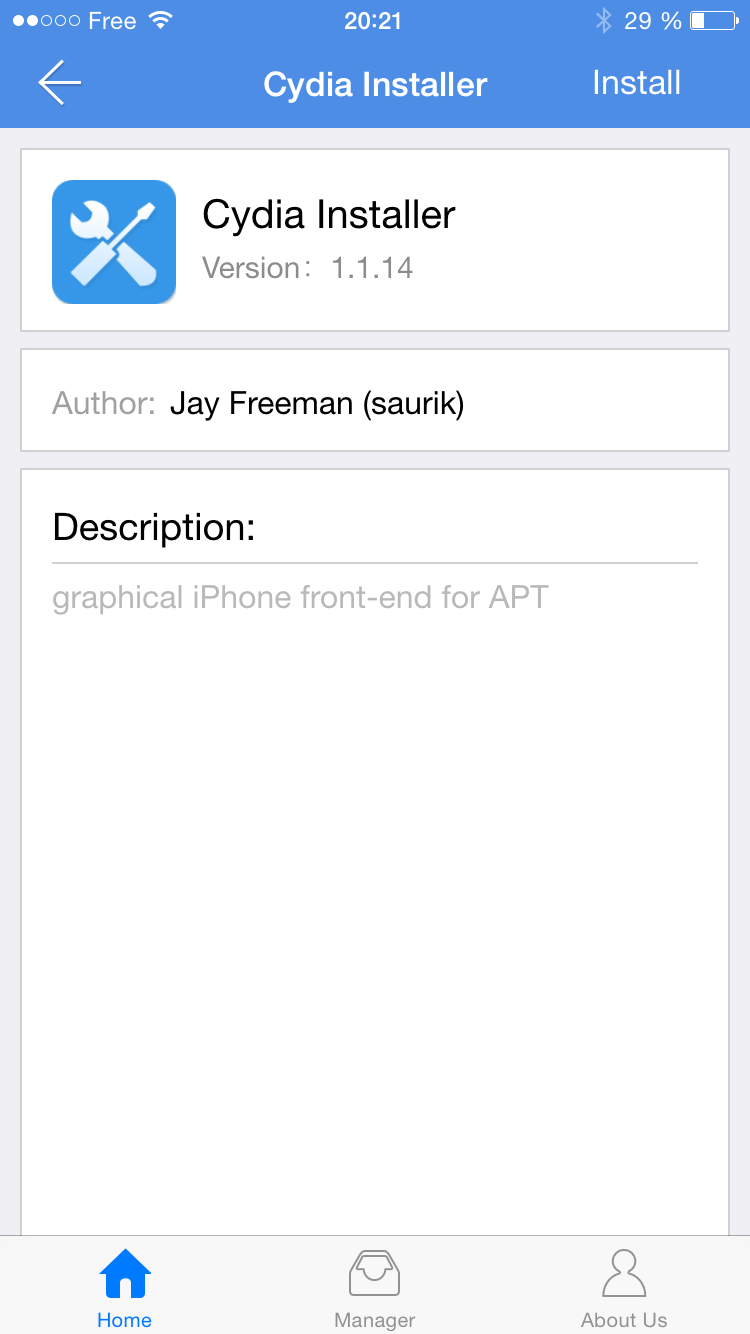 - Sur cet onglet « Home », sélectionnez « Install Cydia«