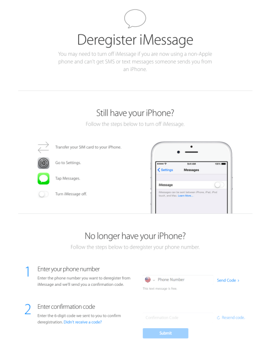 Pour ceux qui sont passés à un autre smartphone et ne possèdent plus d’iPhone, le site propose un champ où ils peuvent entrer leur numéro de téléphone, recevoir un code de confirmation et entrer ce code pour confirmer leur désinscription à iMessage. Apple indique également la procédure à suivre pour se désinscrire et désactiver iMessage si vous avez toujours un iPhone.