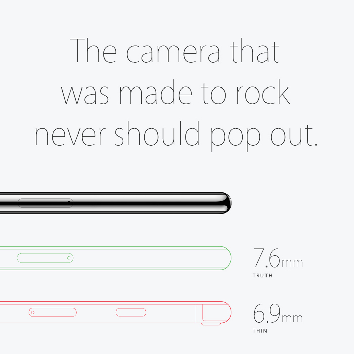 – L’anneau métallique protubérant qui encercle le capteur photo des iPhone 6 et iPhone 6 Plus a disparu, tout comme les controversées bandes de séparation des antennes réseau et Wifi ;