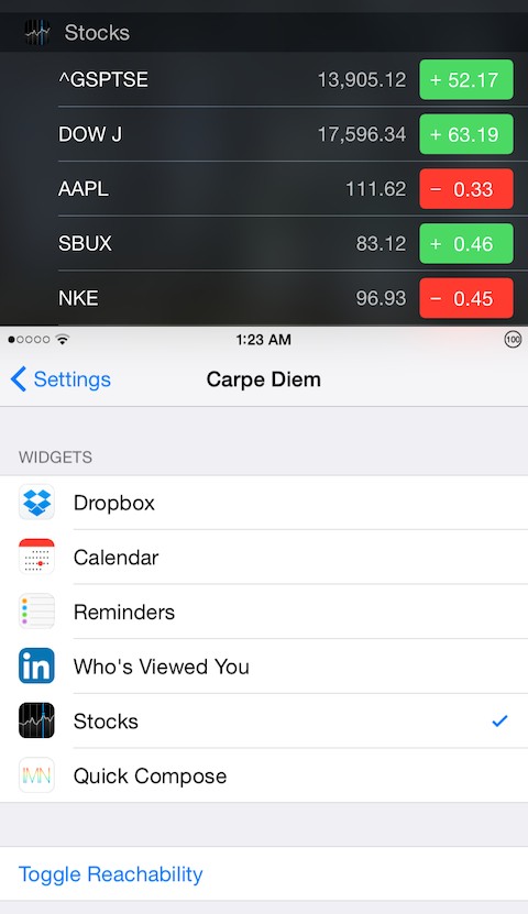 carpediem1Le tweak vous permet d’afficher les widgets natifs de l’iOS mais également n’importe quels autres widgets tiers.