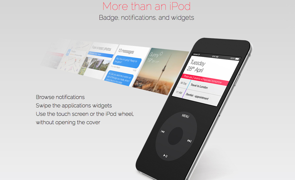 Aussi, le concept n’oublie pas qu’il s’agit néanmoins d’un iPhone et imagine donc pouvoir utiliser autre chose que le lecteur de musique, comme le calendrier ou d’autres widgets qui s’adapteraient à l’iPod Cover.