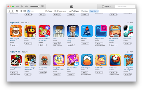 Apple avait déjà ajouté une section pour les enfants en 2013, mais il semble qu’il s’agisse cette fois-ci d’une version remaniée qui reflète la nouvelle publicité d’Apple pour les achats in-app. Elle n’apparaît pas sur la page principale de l’App Store.