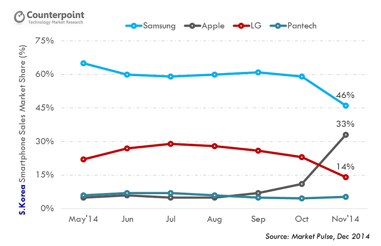 En effet, selon les chiffres fournis par le cabinet Counterpoint Research (données recueillis notamment auprès des distributeurs), Apple serait en phase de rattraper Samsung sur le marché sud-coréen, alors que celui-ci était loin devant il y a quelques mois.