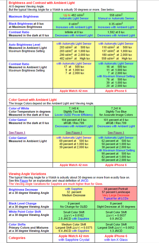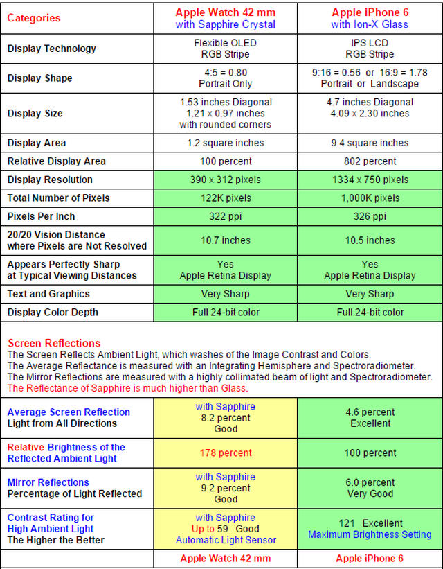 Dans son rapport (disponible ici), la firme apporte un certain nombre de critères qualitatifs et quantitatifs permettant de se faire une idée plus précise des points forts de l’écran de l’Apple Watch en général par rapport à l’iPhone 6 (ce qui n’est pas rien).