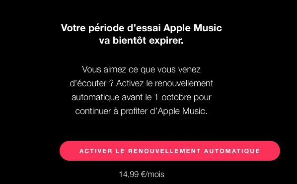 Une partie des utilisateurs va choisir de s’abonner, tandis qu’une autre va tout simplement partir et probablement ne plus jamais revenir. Dans ce cadre, une notification push vient d’être envoyée aux usagers sur iPhone et iPad afin de leur proposer de continuer à profiter d’Apple Music moyennant 14,99€ par mois, à partir du 1er octobre.