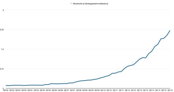 Pour l’année fiscale 2015, Apple a investi plus de 8 milliards de dollars en R&D. Cette somme ahurissante représente deux milliards de plus qu’en 2014, et laisse présager des produits toujours plus novateurs et perfectionnés pour le futur.