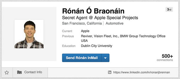 Ainsi, au cours de cet été, un certain Rónán Ó Braonáin aurait été engagé par la firme de Cupertino. Sur son profil LinkedIn, l’intrigant personnage arbore actuellement la fonction d’« agent secret » pour le compte d’Apple et ses projets spéciaux.