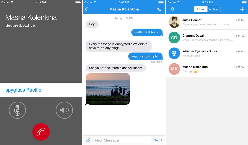 Les textes, images, vidéos, musiques et même les appels sont cryptés selon un protocole ZRTP et Open Whisper Systems assure ne conserver aucune clé de déchiffrement.