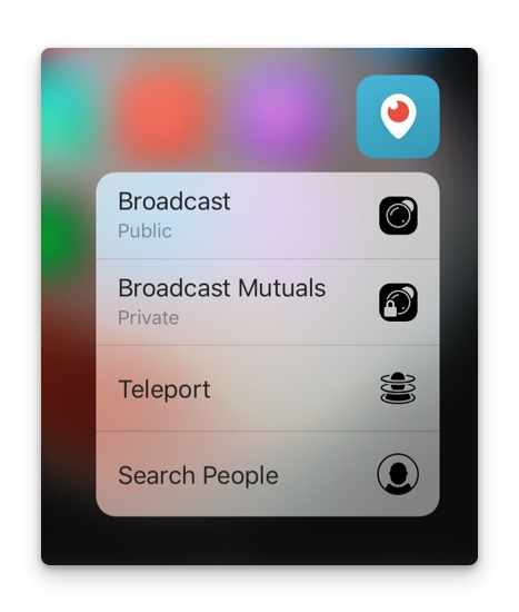 Grâce à 3D Touch, Périscope les heureux propriétaires d’iPhone 6S/6S Plus pourront utiliser la sensibilité de leurs écrans pour avoir accès à quelques raccourcis plutôt bien pensés qui proposent : de passer en broadcast public, démarrer un broadcast privé, le téléport et la recherche de personnes ; ceci directement depuis l’icône de l’application sur l’écran d’accueil.