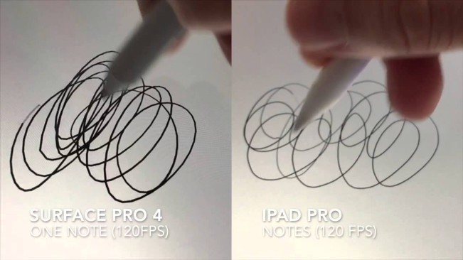 Déjà premièrement comme c’est déjà dit il aurait fallu comparer quelque chose de comparable, et donc tester le stylet de la Surface Pro au sein d’une appli de dessin style Fresh Paint… Deuxièmement, si on regarde bien, les mouvements faits au stylet sur la Surface Pro 4 sont plus amples et plus rapides que ceux réalisés sur l’iPad…