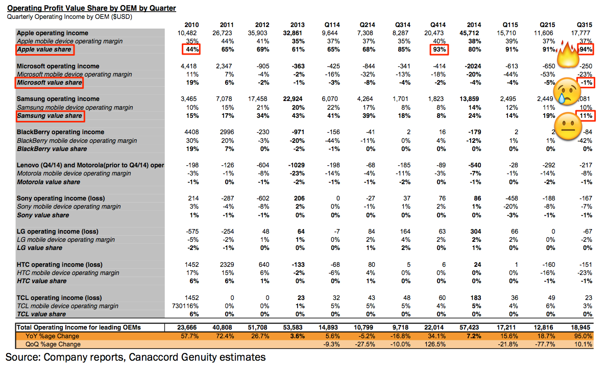 D’après un calcul effectué par Cannacord Genuity, l’iPhone à lui seul cumule 94% des profits de l’industrie mobile au troisième trimestre 2015. L’an dernier, à la même période, ce pourcentage s’élevait à 85%.
