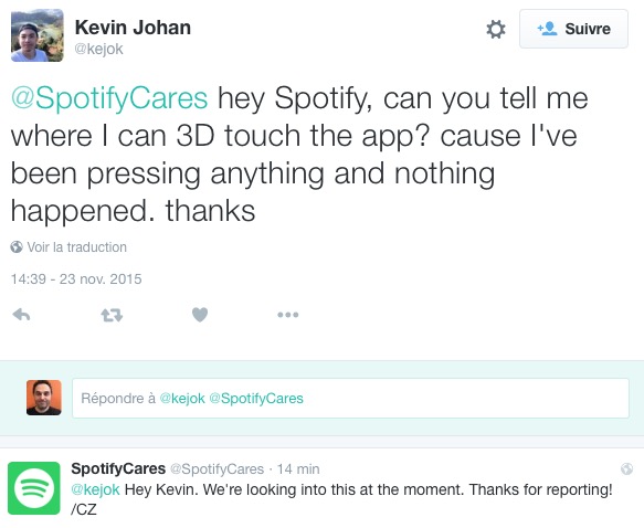 Spotify a réagit quelques instants après, notamment en retirant la mention faisant état la compatibilité de son application avec le 3D Touch, et souligne qu’il s’agit d’une souci mineur, qui sera réglé sous peu.