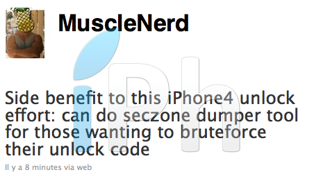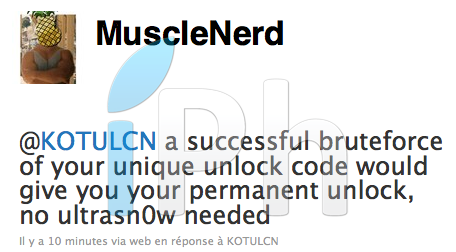 Un nouveau tweet pour vous informer que le prochain outil de désimlockage développé par MuscleNerd et PlanetBeing permettra via BruteForce de trouver le code de désimlockage.
