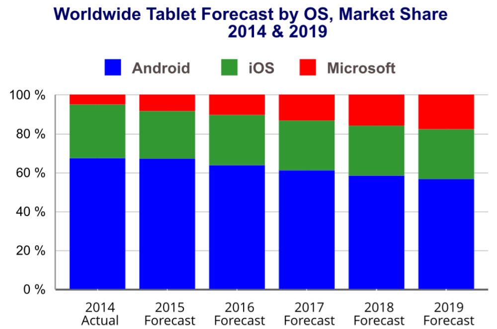 Ainsi, Apple passerait de 24,5% de parts du marché à 25,8% l’année prochaine. Cependant, cette croissance freinerait par la suite. Microsoft serait le véritable gagnant dans cette transition. L’entreprise passerait de 8,5% de parts du marché à l’heure actuelle à 17,8% en 2019. Android serait quant à lui mis en échec et chuterait de 67% à 56,5% dans quatre ans.