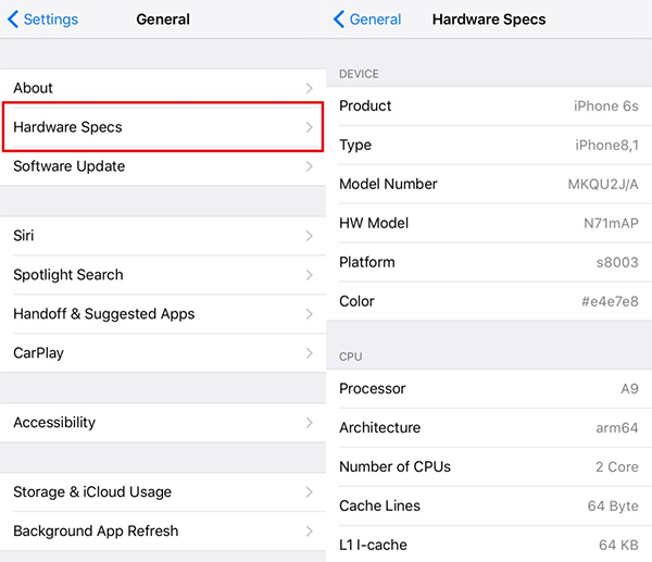 Aussi, tout comme Geekbench 3 pour iOS, HardwareSpecs vous fournit le numéro de modèle de la puce qui pourrait être utile si vous voulez vérifier rapidement quelle puce A9 est présente dans vos iPhone 6s ou 6s Plus réputée pour ne pas avoir les mêmes performances suivant qu’elle provienne de Samsung ou de TSMC.