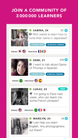 L’avantage est que vous discutez avec des personnes qui parlent réellement une langue. Il s’agit d’une véritable mise en situation doublée d’une immersion dans une culture étrangère, le tout depuis votre iDevice. C’est également l’occasion de faire des belles rencontres et pourquoi pas de planifier un voyage…