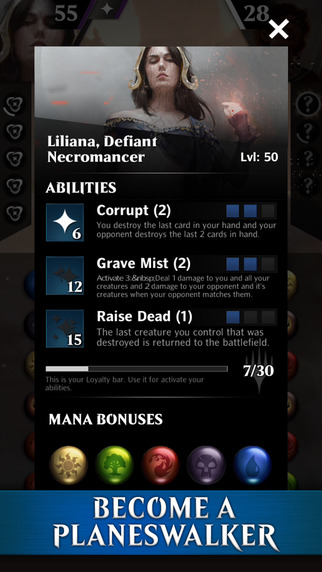 Il sélectionne également le mage qu’il souhaite incarner en fonction de ses compétences et spécificités. On dénombre par exemple Chandra la mage de feu et ses boules de feu ou Liliana la nécromancienne capable de ranimer les morts.