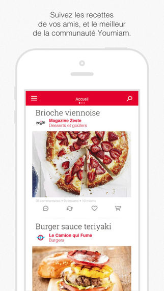 Tel un Twitter de la cuisine vous pourrez suivre le fil de recettes que propose chacun de vos amis, ainsi que les autres amateurs de bons petits plats cuisinés qui utilisent l’application. Choisissez celle que vous souhaitez réaliser et Youmiam vous prépare une liste de course pour vous assurer de bien avoir tous les ingrédients requis.