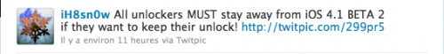 C’est via leur twitter que Sherif Hashim (auteur de l’exploit du baseband 05.12.01) et iH8Sn0w (auteur de Sn0wBreeze) mettent en garde les utilisateurs d’appareils désimlocké via UltraSn0w de ne pas mettre à jour leur appareil en 4.1 beta 2.