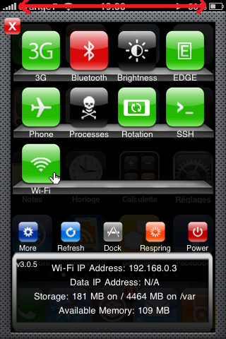 Il s’agit surement d’un must sur iPhone. SBSettings est une application disponible gratuitement sur Cydia et est compatible iOS 4. Cette application est un addon à MobileSubstrate, et va vous permettre d’activer/désactiver des fonctionnalités de votre appareil via des mini-icônes appelées « Toggle ». Bien sur, un nombre gigantesque de toggle est disponible sur Cydia. Vous pourrez ainsi désactiver Wi-fi, bluetooth, 3G etc … très rapidement !