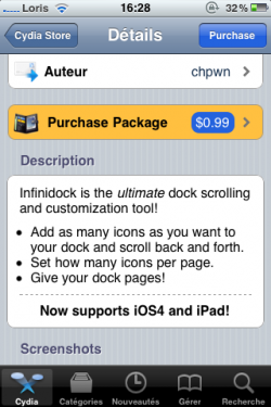 InfiniDock est une application développée par ChPwn, membre de la dev-team. Cette application vous permet de mettre une infinité d’icônes dans votre Dock, et de scroller de droite à gauche ou de gauche à droite pour naviguer entre elles.