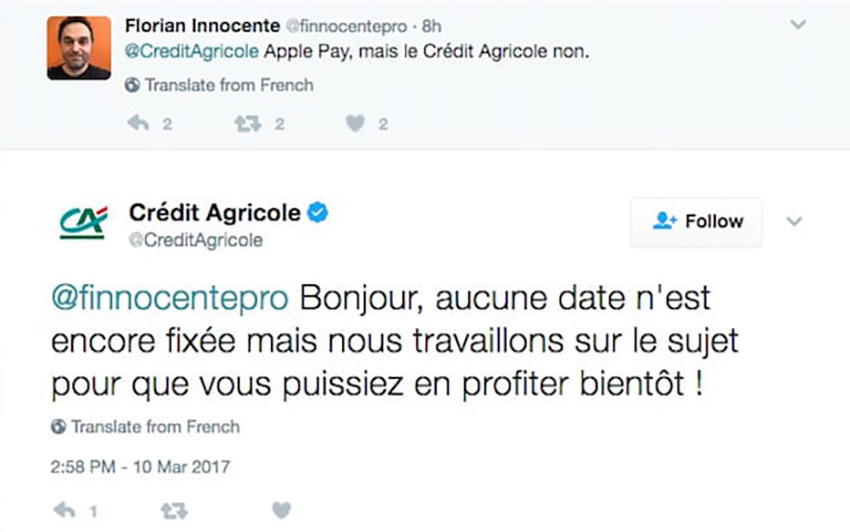 Le Crédit Agricole dit travailler sur le support d’Apple Pay, sans donner plus de détails. La banque affirme en réponse à un client sur Twitter qu’ « aucune date n’est encore fixée (pour la sortie d’Apple Pay, ndlr) », mais que le projet est pris en charge afin que les utilisateurs puissent « en profiter bientôt ».