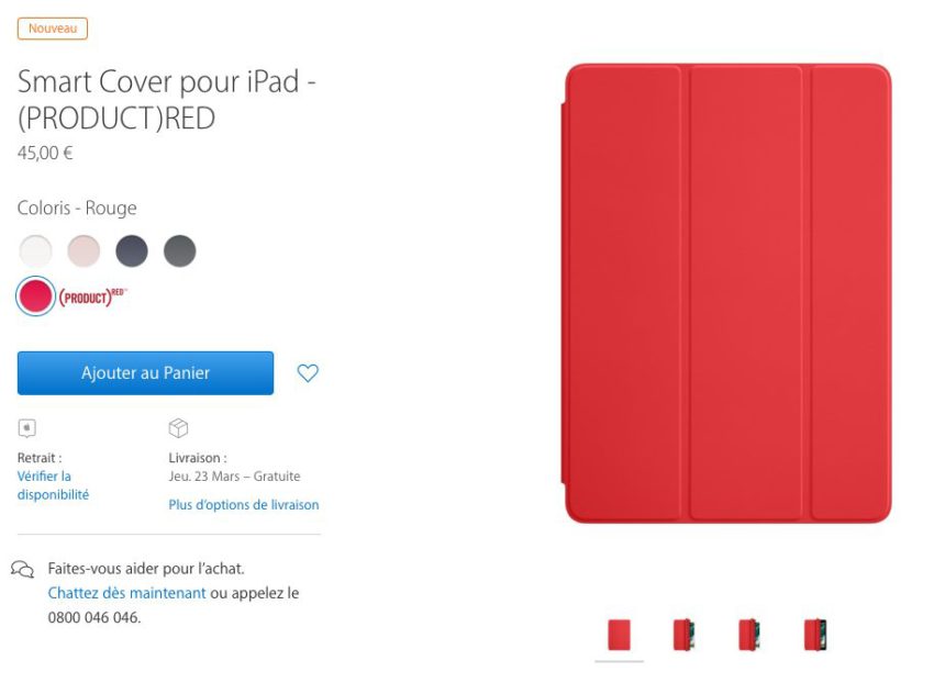 Concernant l’iPad, de nouvelles Smart Cover de différentes couleurs (blanc, Rose des sables, Bleu nuit, (RED) et Gris anthracite) ont été ajoutées. La liste complète peut être retrouvée à cette adresse.