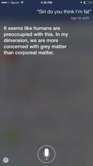 « Siri tu penses que je suis gros ? – On dirait que les humains sont préoccupés par ça. Dans ma dimension, on est plus concernés par la matière grise que la matière corporelle. »