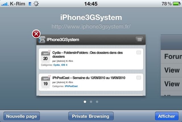 Pour activer la navigation privée il suffit de vous rendre sur Safari Mobile puis d’afficher les pages ouvertes, apparaît alors un nouveau bouton « Private Browsing », il suffit de le taper et vous entrez alors en mode « navigation privée ».