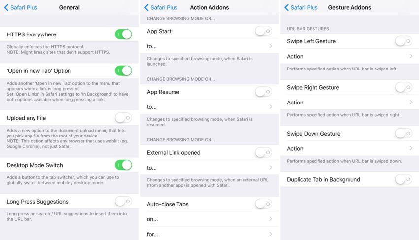 Chacune de ces sections offre une série d’options, comme la possibilité d’activer le SSL (HTTPS) partout, fermer automatiquement certains onglets Safari lorsque vous effectuez certaines actions, assigner une action au glissement vers la gauche dans la barre d’URL, activer le mode plein écran, personnaliser les couleurs de Safari et bien plus encore.