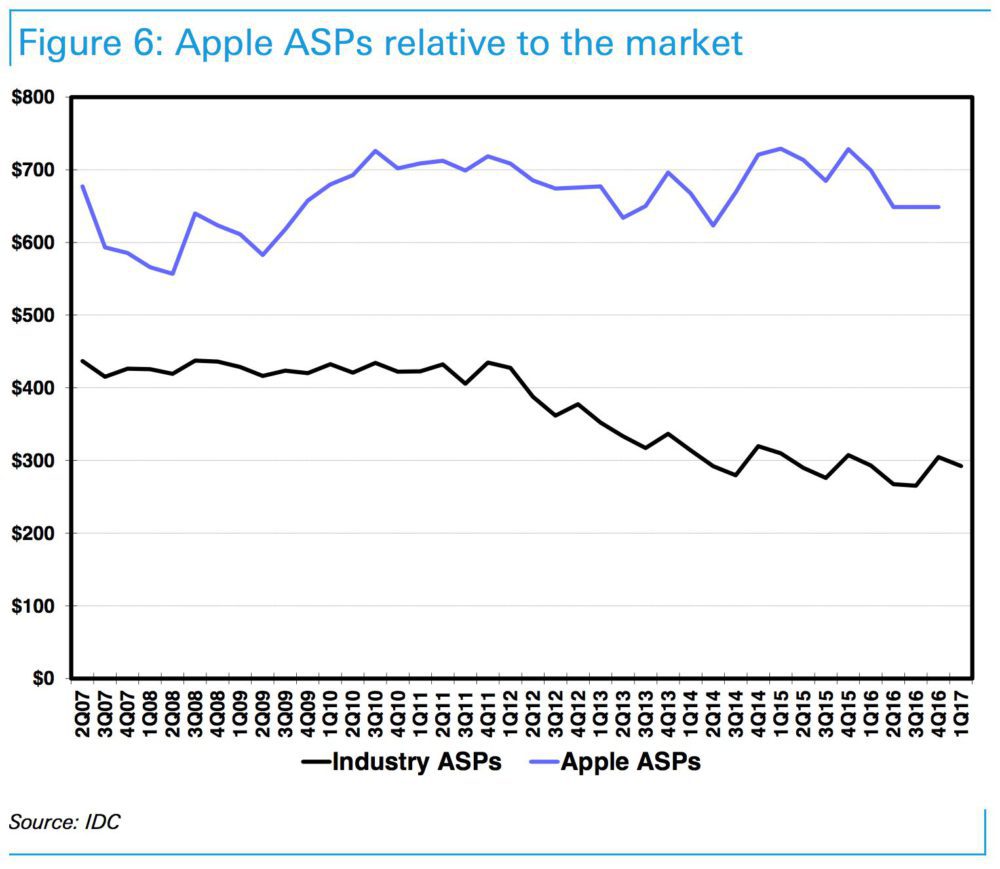 Dans ce second graphique, vous pourrez y découvrir le positionnement des prix de Apple face au reste du marché. On voit clairement que les prix sont en hausses contrairement aux prix du marché qui eux sont en baisse. Une rumeur a par ailleurs annoncé que l’iPhone 8 pourrait coûter $1000.