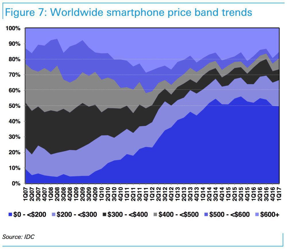 Dans ce graphique, vous pourrez y découvrir l’évolution des prix des smartphones depuis 2007, comme on peut le voir, les smartphones inférieurs à $200 représentaient moins de 10% du marché en 2007 et ils représentent aujourd’hui plus de 50% du marché.