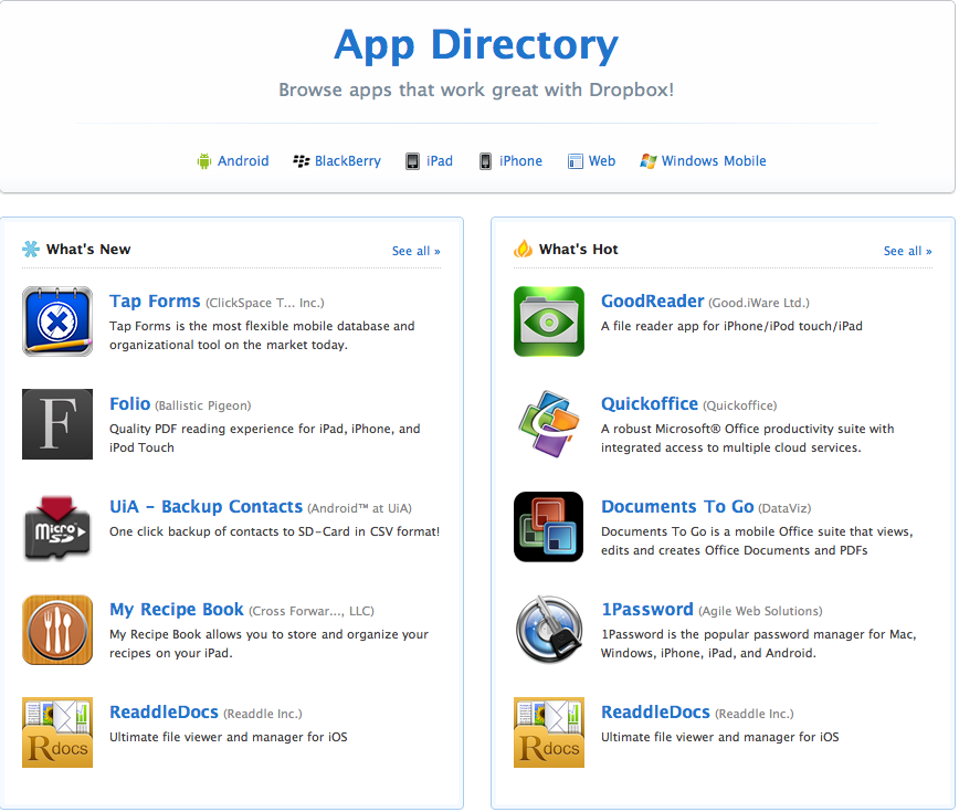 App Directory, c’est une base de données de toutes les applications susceptibles de fonctionner avec DropBox et son système de transfert de fichiers.