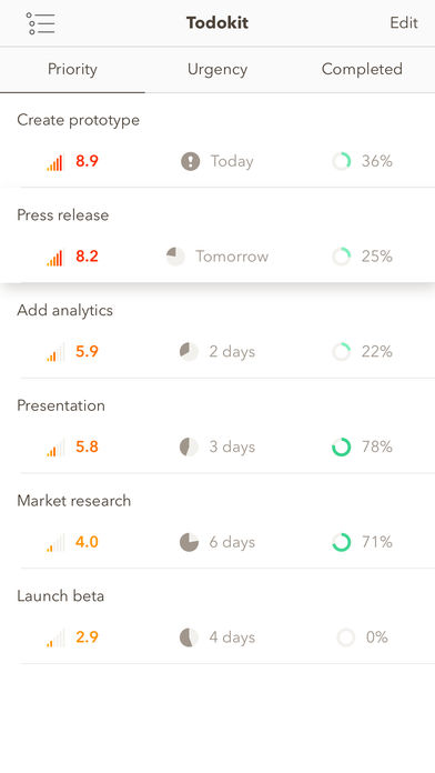 Organiser les tâches par projet, priorité et urgence. Suivre vos progrès pour chaque tâche et vérifier vos réalisations passées. Regrouper les projets et réorganiser les tâches avec un glisser-déposer. Nécessite iOS 9.0 ou une version ultérieure. Sans achats in-app.