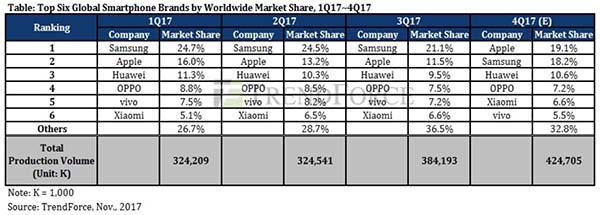 L’iPhone X devrait permettre à Apple de faire un grand bon en avant et ainsi dépasser Samsung en termes de parts de marché dans le domaine des smartphones.