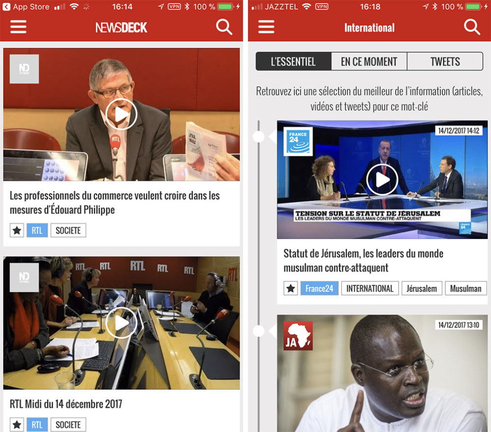 Newsdeck est un véritable agrégateur de news sur iPhone. Cette appli de news pour iPhone fait directement le tri pour vous sur toutes les informations. En effet, cette application est capable de sélectionner pour vous les informations les plus pertinentes parmi plus de 300 sites internet, mais également parmi Youtube ainsi que tous les comptes Twitter.