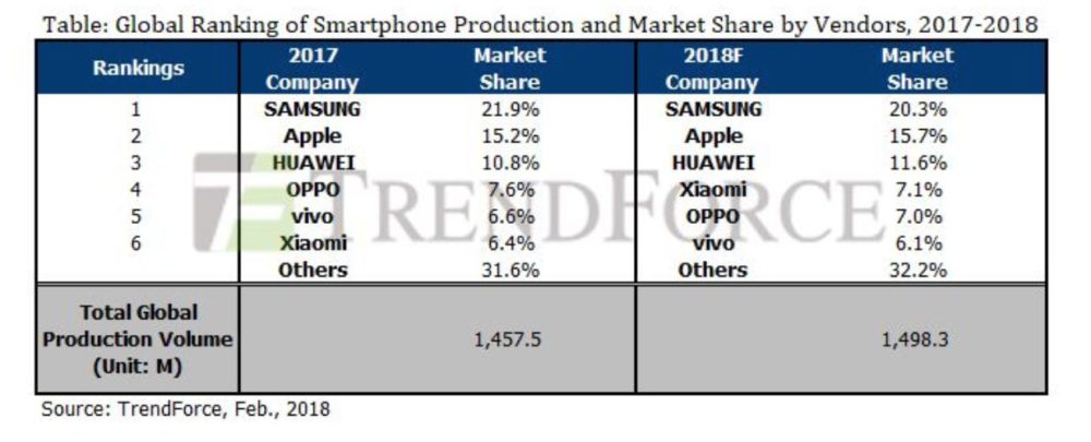 En plus de ses excellents résultats dans le marché des ordinateurs portables (cf. Marché des ordinateurs portables : Apple devient le 4e plus grand vendeur), TrendForce prédit une hausse des ventes des smartphones d’Apple en 2018.