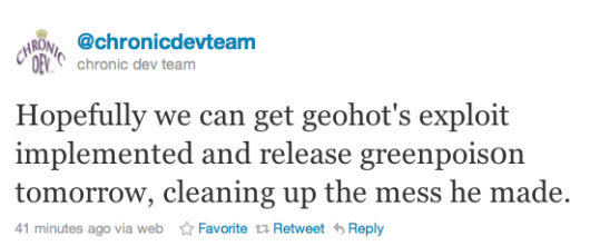 Peu de temps après la sortie de LimeRa1n, l’outil de jailbreak de l’iOS 4.0 à l’iOS 4.1 développé par Geohot, la chronic-dev team a publié un tweet assez intéressant.