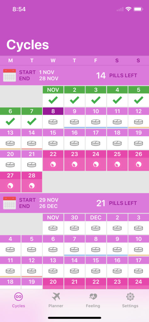 Appli pour aider les femmes a ne pas oublier quand prendre les pilules. L’appli intègre les cycles sur un calendrier et informe de la date du prochain cycle.