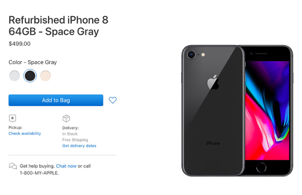 Les deux modèles sont (pour le moment) disponibles uniquement dans la version de 64 Go avec les coloris Argent, Gris Sidéral et Or. Chaque modèle bénéficie d’une réduction d’environ 15% ; l’Phone 8 reconditionné est vendu pour 499 dollars, contre 599 dollars pour un exemplaire neuf ; l’iPhone 8 Plus reconditionné se vend à 599 dollars, contre 699 dollars pour un modèle neuf.