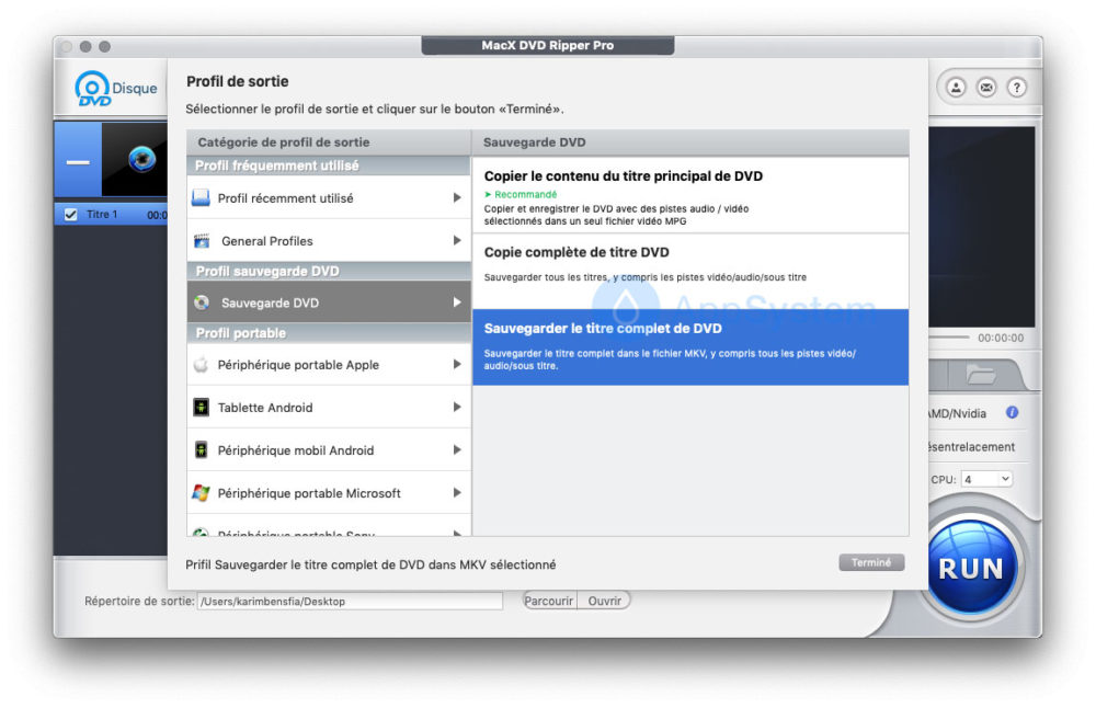 Il faut maintenant sélectionner le format de sortie de votre DVD. Dans la liste, sélectionnez maintenant : Sauvegarde DVD puis > Sauvegarder le titre complet de DVD