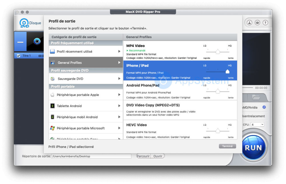 Nous allons maintenant convertir votre DVD dans un format vidéo lisible sur un Mac ou un iPad, iPhone. Pour cela répétez les opérations depuis l’étape 1 et sélectionnez : General Profiles puis MP4 Video ou iPhone / iPad et sélectionnez avec le curseur la qualité de la vidéo. HQ étant la meilleure qualité possible.