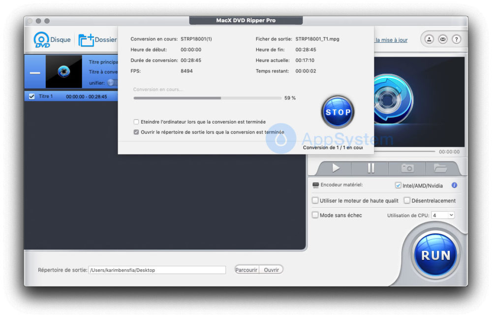 Cliquez maintenant sur RUN et le logiciel va débuter la conversion du DVD dans le format choisi.