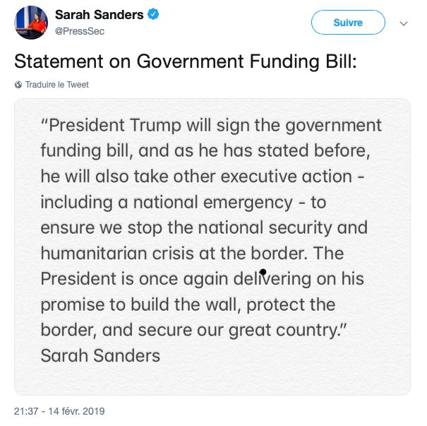 Sarah Sanders, attachée de presse de la Maison Blanche, a publié un tweet concernant un projet de loi de financement lié au gouvernement qui serait une « urgence nationale ». L’information a amusé une grande partie de la twittosphère.