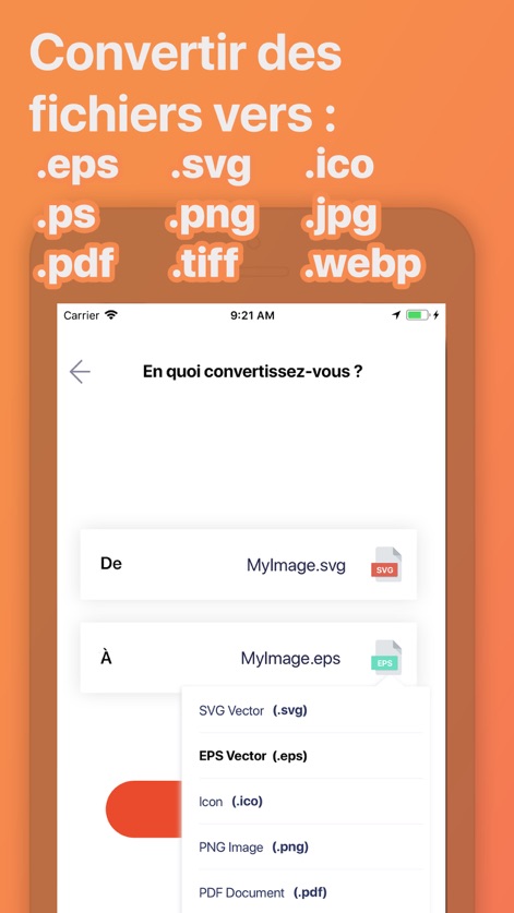 Le convertisseur Vector peut convertir presque toutes vos images, photos ou fichiers vectoriels en : SVG, EPS, ICO, PNG, PDF, PS, JPG, EMF, WMF, BMP, TIFF, WEBP, ou DXF !