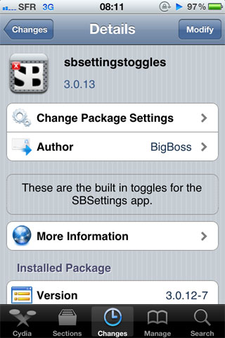 Dans la journée, une mise à jour du paquet SBSettingsToggle, directement lié au crach de SBSettings, a été mis à jour apportant la compatibilité avec l’iOS 4.2.1