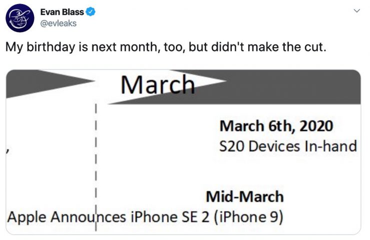 Evan Blass est connu pour ses prévisions justes sur tout ce qui concerne le monde du mobile. Outre la sortie de l’iPhone 9, le leaker annonce par ailleurs la sortie du Galaxy S20 de Samsung qui se ferait le 6 mars prochain.