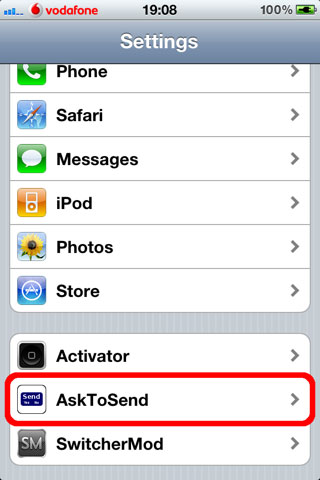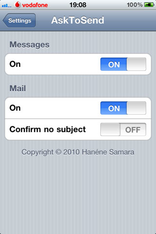 AskToSend est un tweak Cydia fort pratique qui vous permet de demander une confirmation avant envoie d’un SMS ou d’un mail (ce paramètre est configurable via les préférences de l’application).